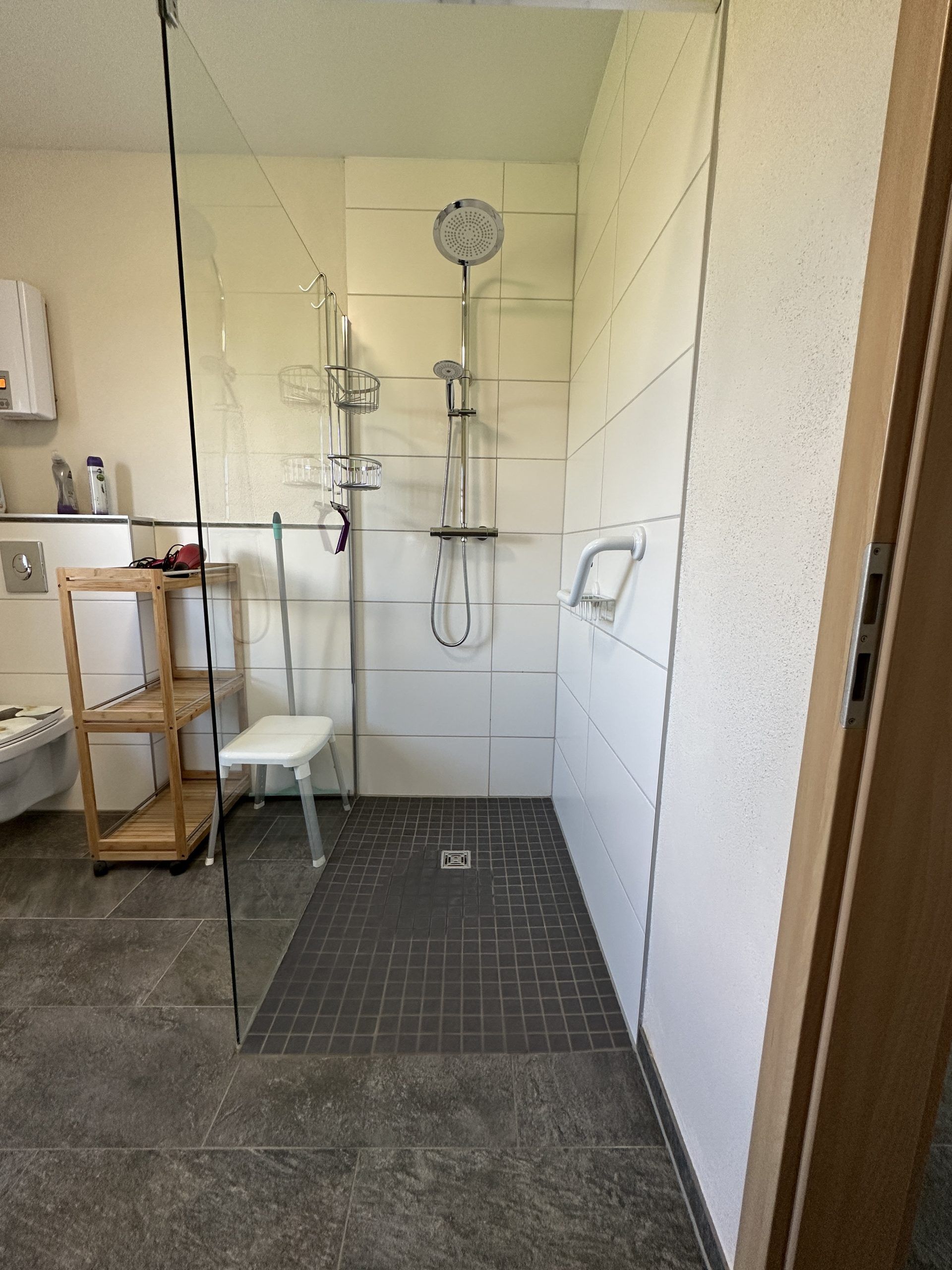 Badkamer: ruime badkamer met (hoofd)toillet, regendouche met handdouche, steun aan de muur, losse douchekruk, badmeubel met voldoende opbergruimte, föhn, raam met rolluik
